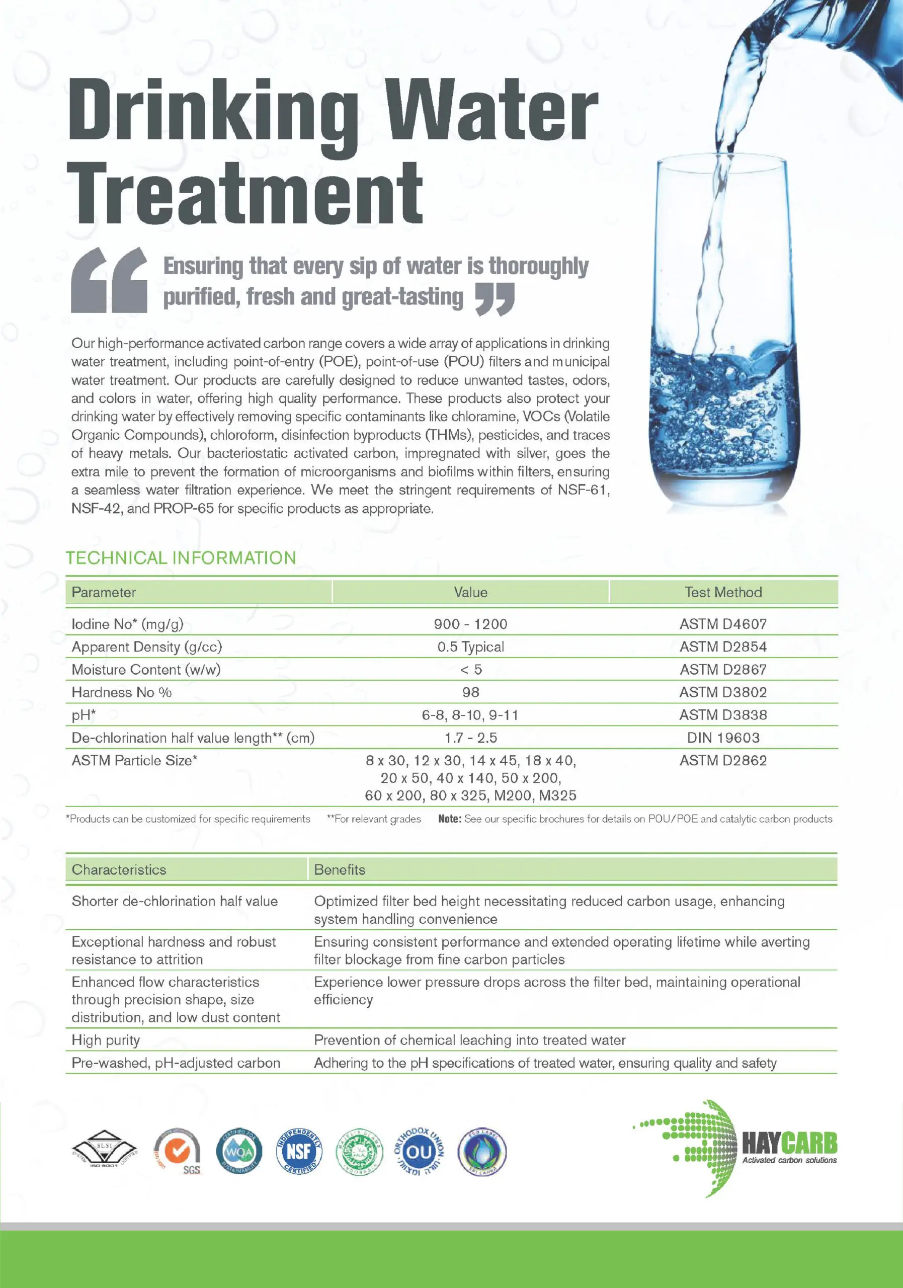 Advanced activated carbon solutions for drinking water purification, removing contaminants while improving taste and ensuring safety.